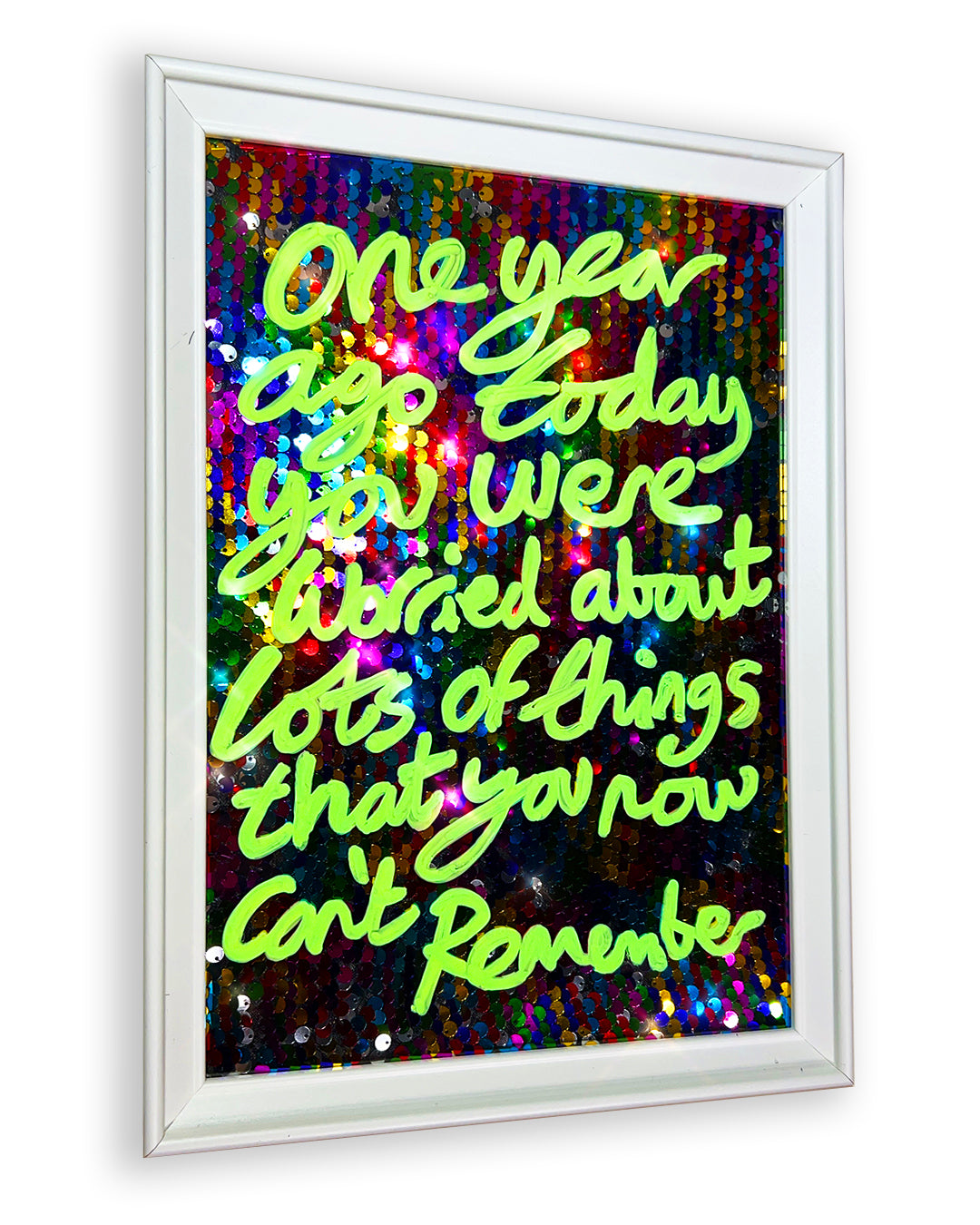 The lettering is hand painted onto the clear acrylic of the frame, giving the words an extra crisp, sharp finish and a floating effect above the sequins.